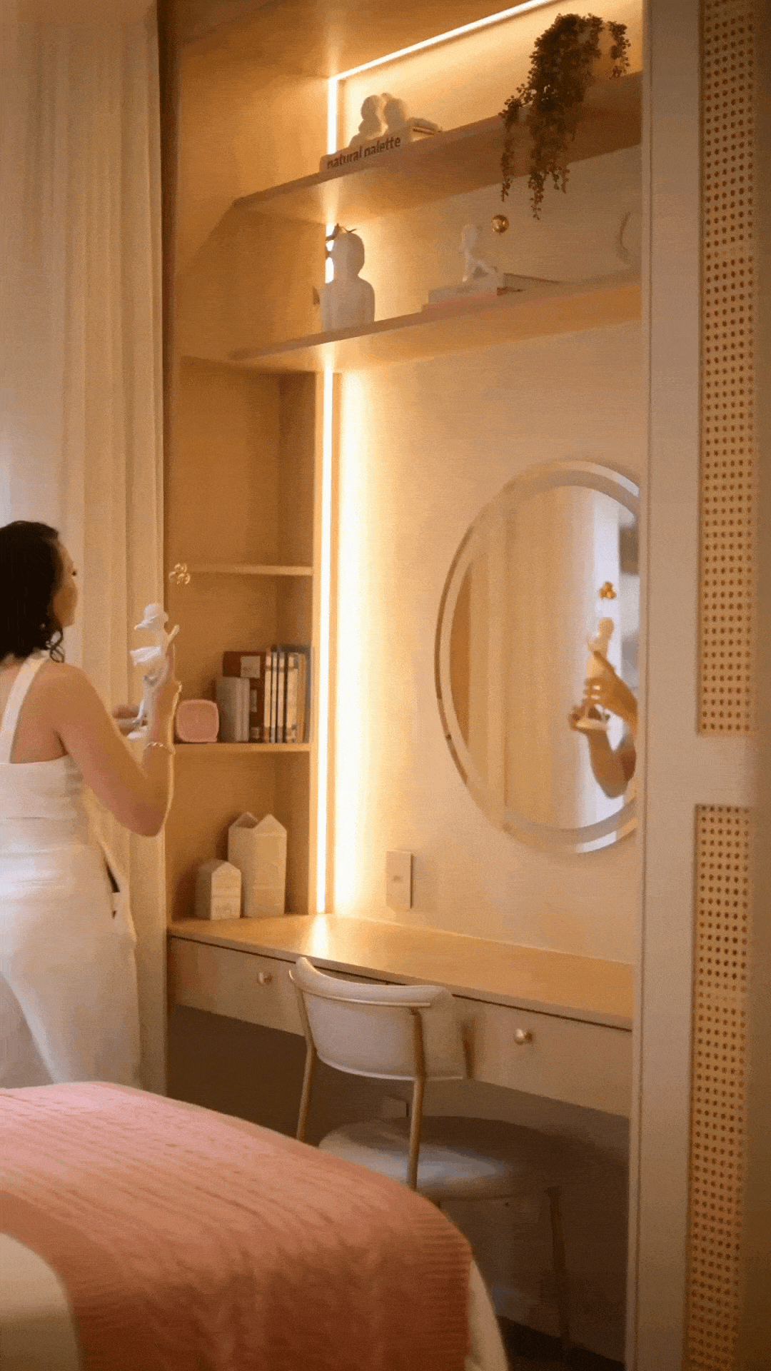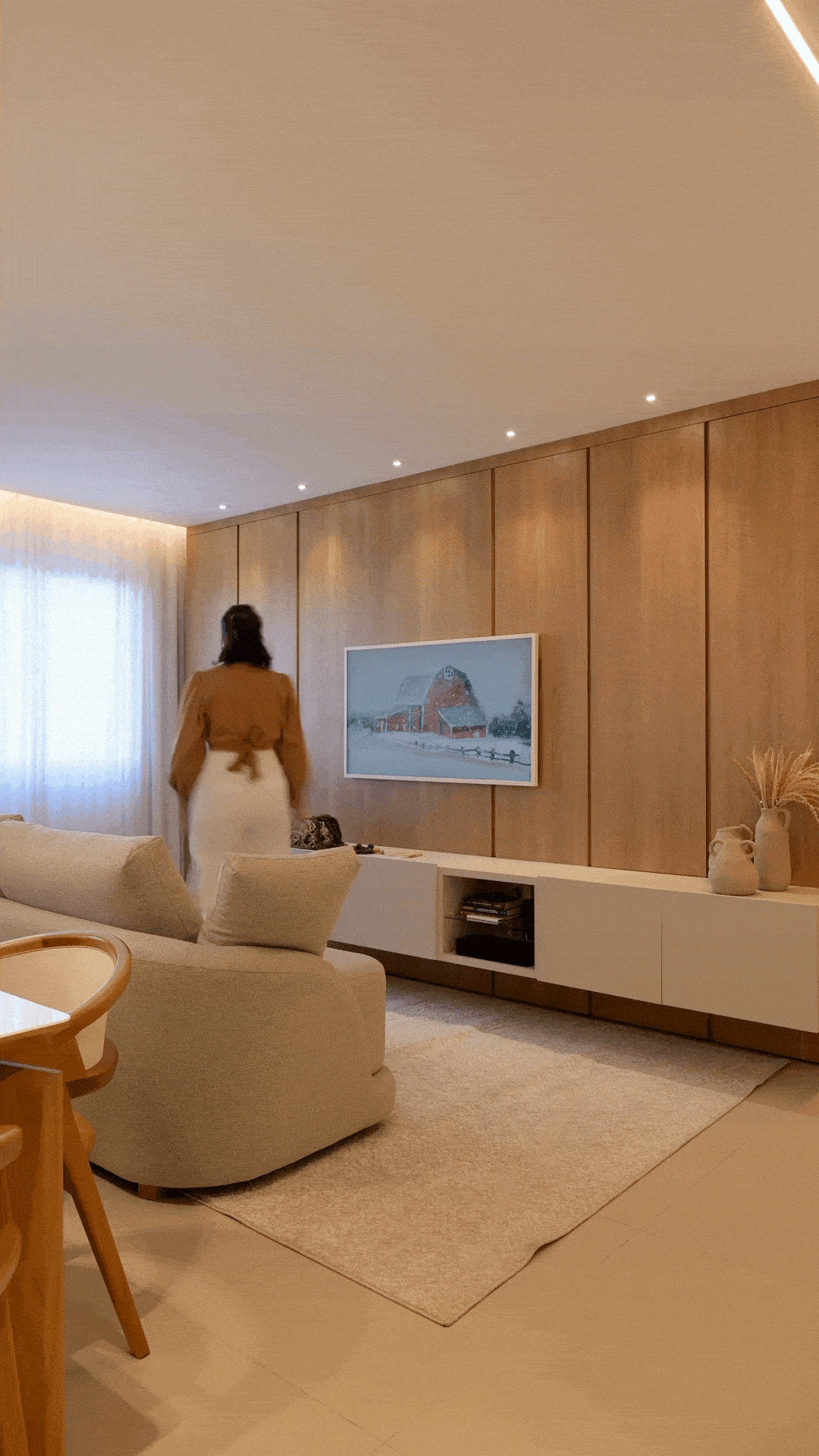 Espaço compacto não é sinônimo de limitação! Neste apartamento cada centímetro foi pensado para funcionar, sem abrir mão da estética. Criamos espaços de armazenamento em locais estratégicos, integramos ambientes, painéis que escondem o banheiro… tudo para que a cliente vivesse com mais conforto, fluidez e leveza.